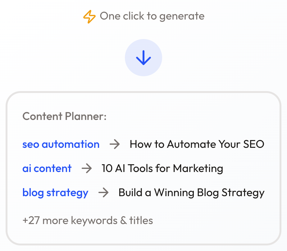 Your content workflow, fully automated. Generate articles, click publish, and your content is live, no manual work required.